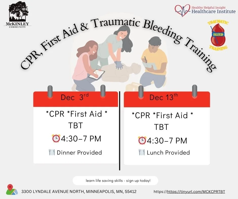 McKinley Community Center will be hosting CPR, First Aid, and Traumatic Bleeding Training. Priority will go to McKinley and North Minneapolis Residents. Learn life saving skills. Sign up today!
